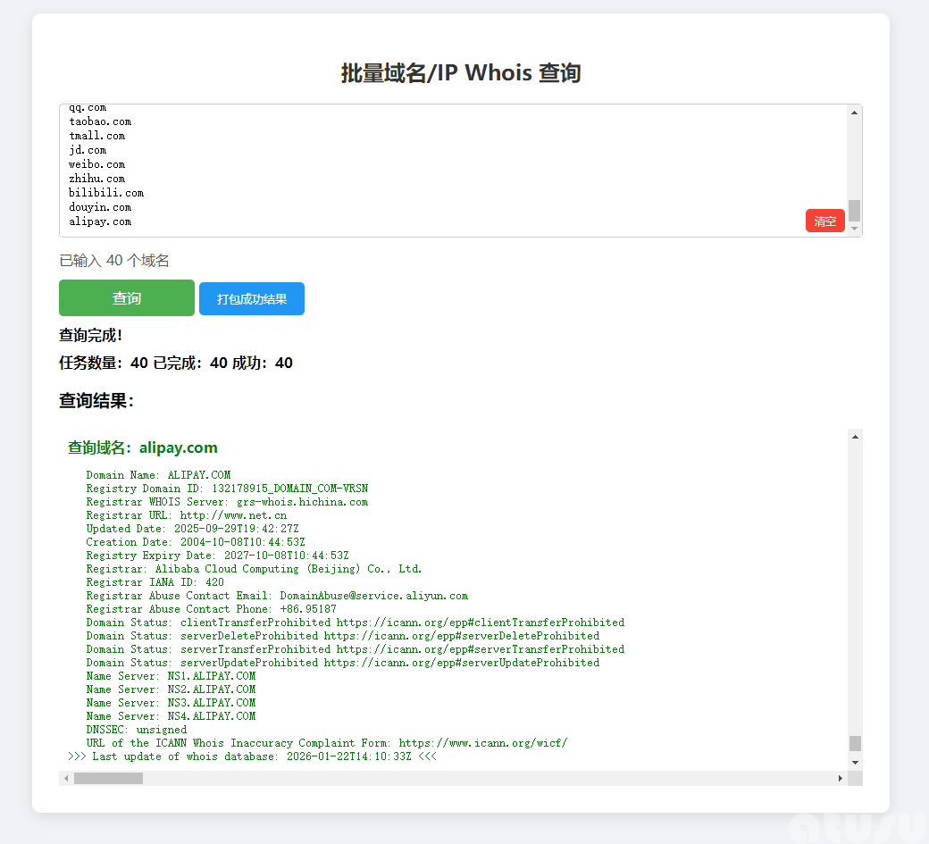 支持单次最多1000个域名批量查询,支持查询结果打包导出